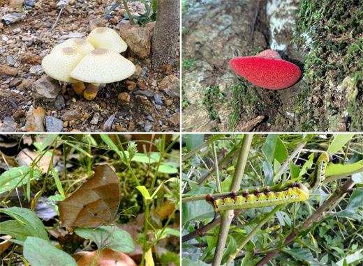 上段右の花はポポーの花です。地味な花でどのような虫が受粉させているのかと思っていましたが、なんとシリアゲムシが花に潜りこんでいました。今年もポポーの実が食べられそうです。都会ではすっかり見られなくなったデンデンムシも我が家では健在です。