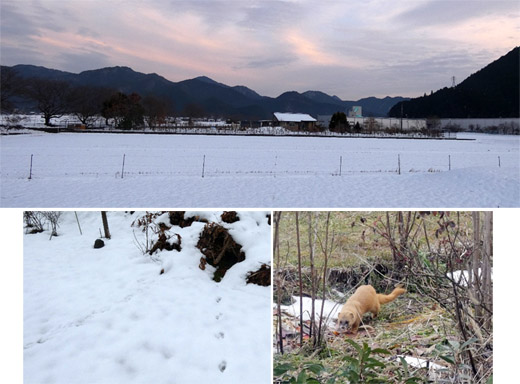 この冬最大の寒波と降雪がありました。高速道路は二日ほど通行止めとなり、解除になってから、おっとり刀で様子を見に行きました。幾分積雪も融けたようで、10センチ余りしかありませんでしたが、きれいな雪景色です。雪は見苦しいものをすべて覆い隠してくれて、嬉しい限りです。雪上に足跡が。わが家の敷地内なので、以前のようにタヌキやキツネが入りこむ隙間はないはずです。数日後に正体が分かりました。想像通りイタチ君でした。河原などではしばしば目撃していましたが、敷地内では久し振りの出会いです。しばらく何かを探しているようでしたが、私の気配を感じるやいなや、素早く走り去っていきました。